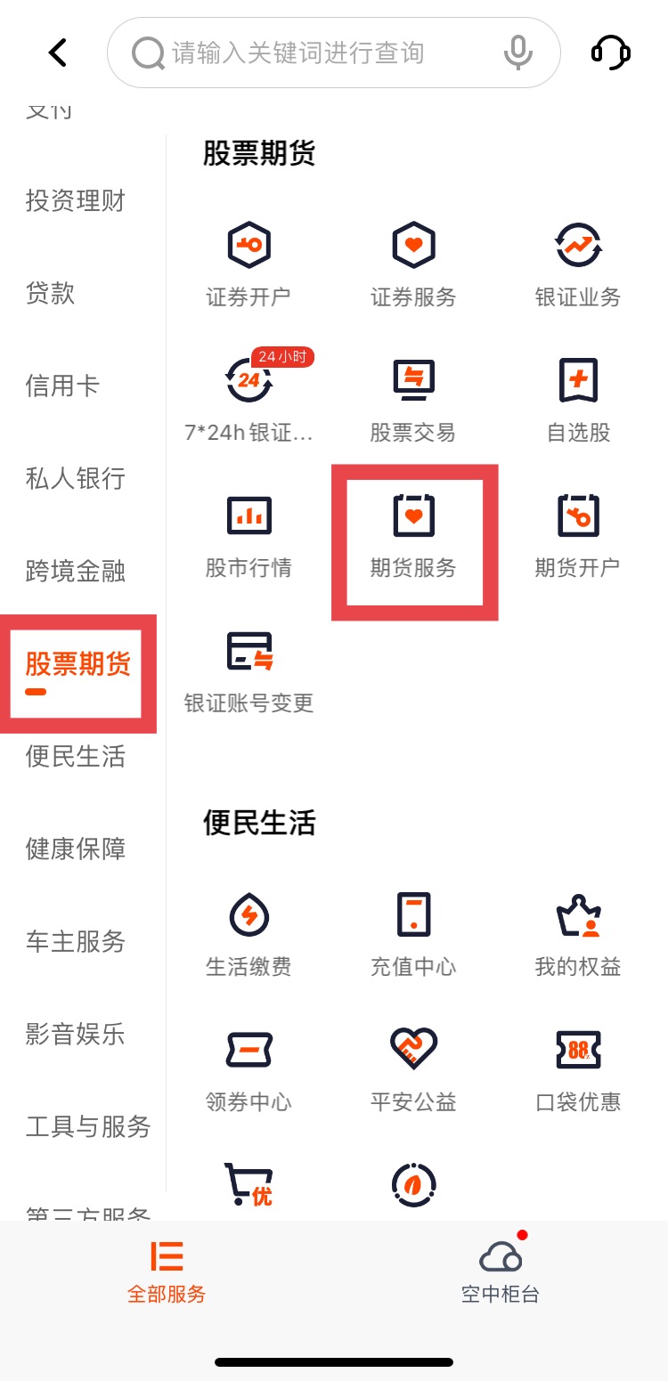 2.找到“股票期貨”--->"期貨服務(wù)"